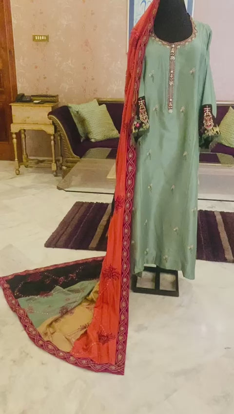 The ensemble is completed with a vibrant, multi-colored pure raw silk shawl, fully embroidered with Resham ari, sequins, and cut beads. The combination of rich hues and intricate detailing makes this piece an embodiment of timeless elegance and sophistication.