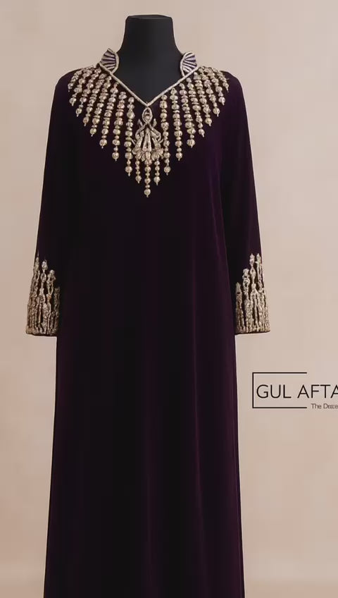 Made from plush velvet, this piece is adorned with exquisite handmade kora dabka and shimmering stone details, creating a perfect blend of opulence and grace.