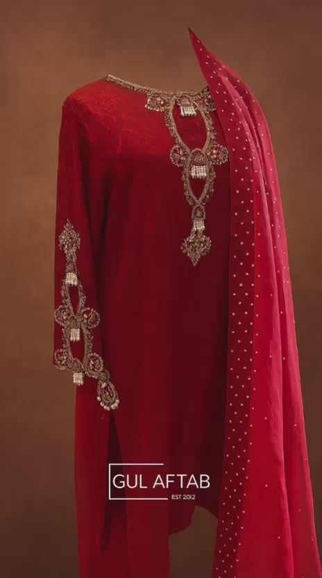 Step into a world of refined luxury with Ruby Desire by Gul Aftab. This stunning outfit features a rich ruby red Jamawar shirt with exquisite handwork, perfectly embodying elegance and tradition. The shirt’s intricate detailing is complemented by pure raw silk handworked flared trousers, offering a flattering silhouette that enhances the overall design.